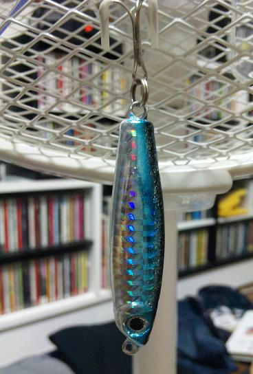 帰ってそのジグを、普通ならウレタンコートって液体でコーティングするらしいんだが、俺は職場で余った耐薬ビニローゼなる塗料でドブ漬けコーティング。