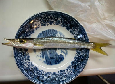 カマスが釣れました。この時期に浜辺から釣れるカマスにしてはいいサイズじゃない?