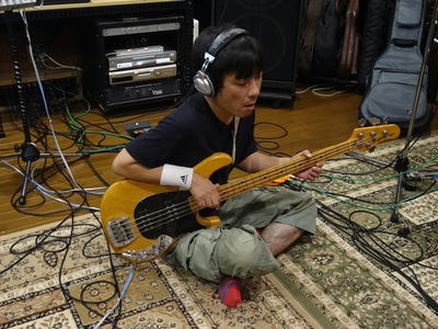 独特なスタイルでベースを録音する利光さん。