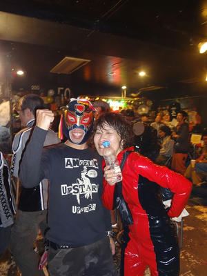 企画の SLEEZ SISTERS リコさんのイメージは「おもちゃ箱をひっくり返したような」ライブであるらしく、会場は手作り感満載に飾りつけされてたり、出演のバンドメンバーさんたちは、思い思いの仮装(コスプレ?)をしてたり。
