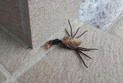 そしたらこいつは「ツマアカクモバチ」というハチで、なんとびっくりアシダカグモを専門に狩る、なんつーとんでないハチらしい!