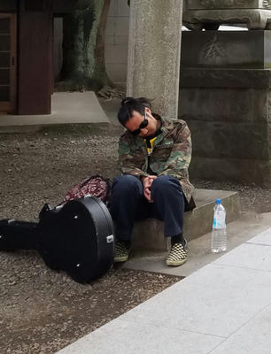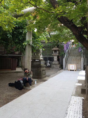 あー、まだ夕方だってのに、酔っ払いが境内の柱にもたれかかって寝ておりますよ・・