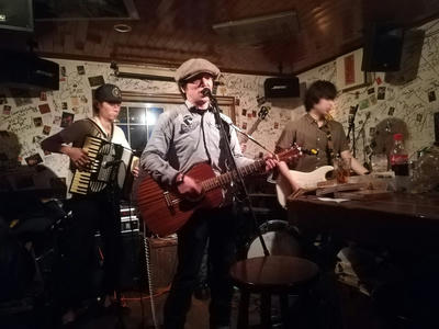 ギター、ベース、ドラムに、アコギ、アコーディオン(トモスケ)という編成。