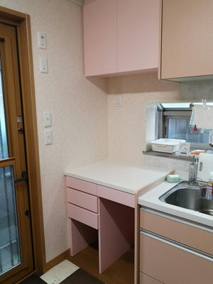 既製品と壁の間に、食洗機を置くカウンター。丈夫には吊り戸棚。
