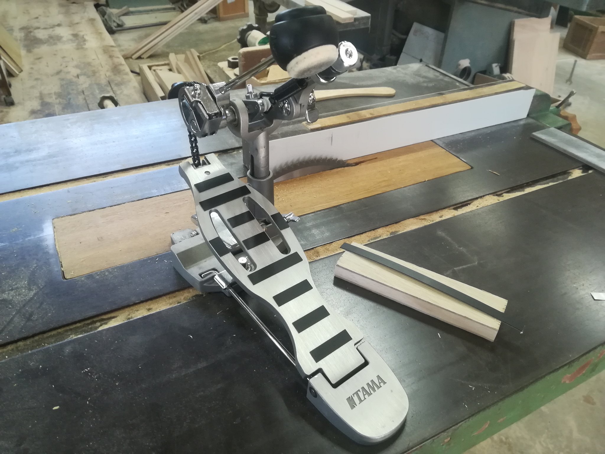 ペダルのフットボードがつるつる滑るので、細くしたメラミン(家具を作るときの化粧版の一種)の板を貼りつけてみました。
