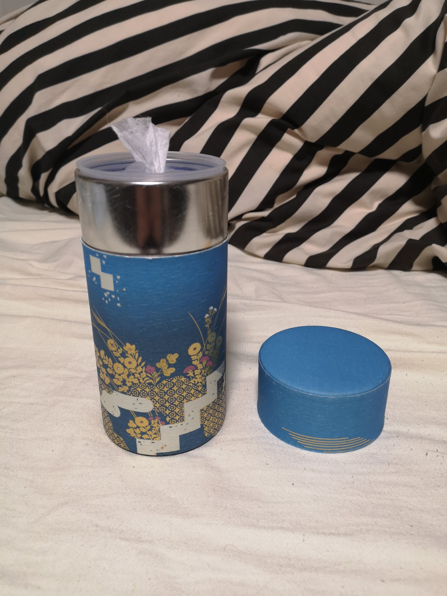 お茶っ葉が入ってた空き缶を利用して、ウェットティッシュホルダー作ってみた。