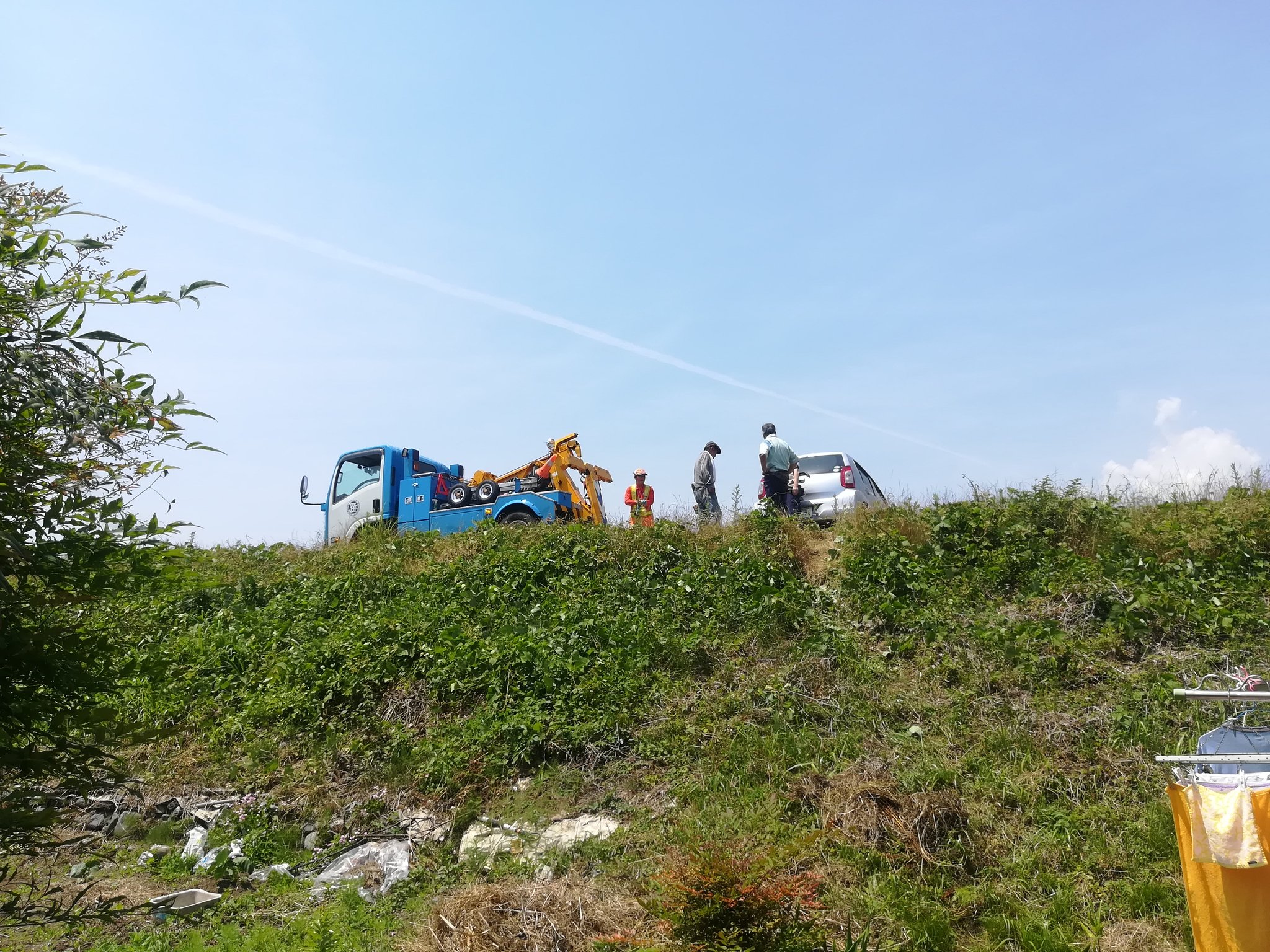 何かと思ったら職場のすぐ横の堤防で車の切り返しに失敗したらしく、堤防から川に車が落ちかけている!