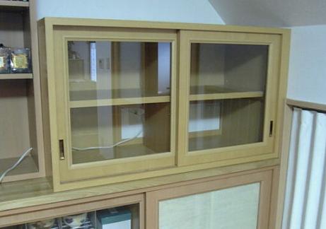 こんな感じのガラス引き戸の棚を作って、取り付けてきました。