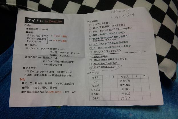 ルールは、警察と泥棒に別れ、泥棒はくじ引きで決められたミッション(「○○を買う」とか)を1人1つ制限時間内にクリアする。全てのミッションをクリアすれば勝利。