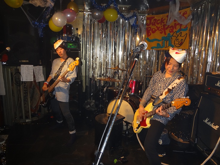 企画の SLEEZ SISTERS リコさんのイメージは「おもちゃ箱をひっくり返したような」ライブであるらしく、会場は手作り感満載に飾りつけされてたり、出演のバンドメンバーさんたちは、思い思いの仮装(コスプレ?)をしてたり。