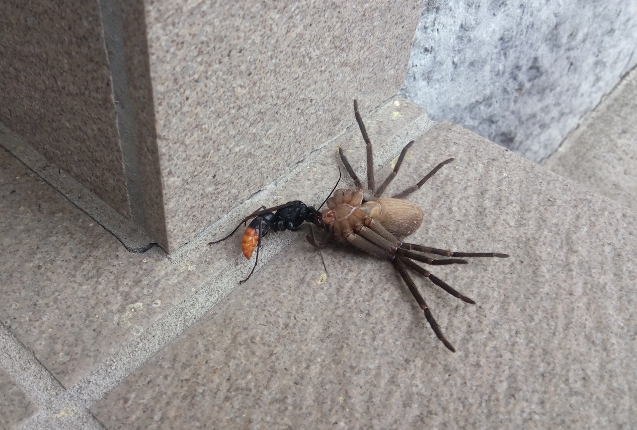 その馬鹿デカいクモを引きずりながら歩いてる(おそらく)ハチを発見した!