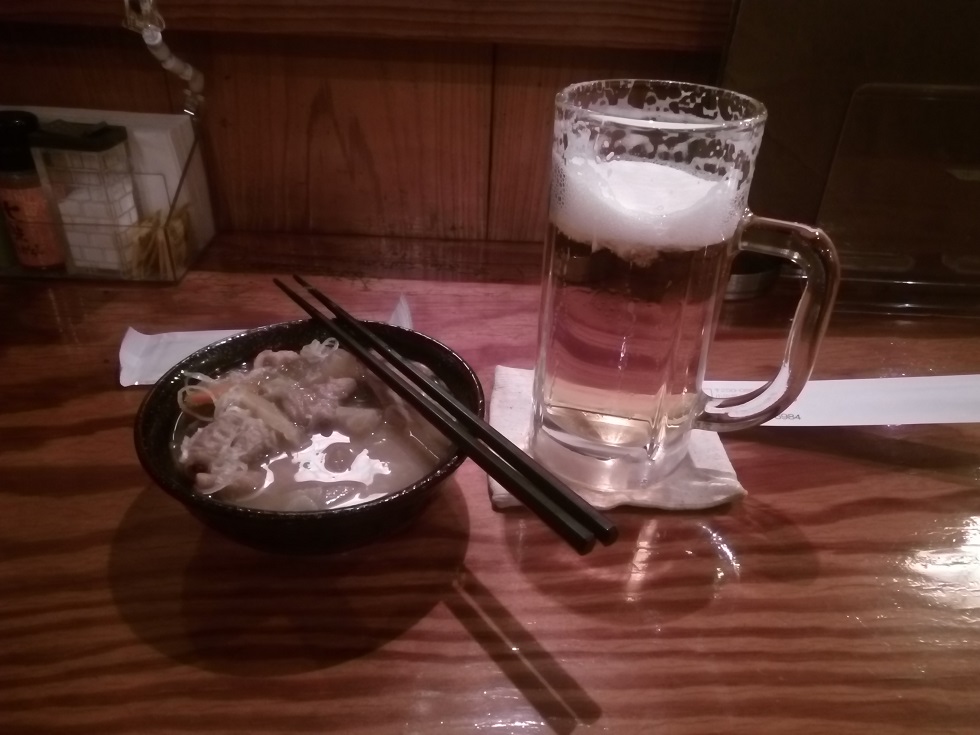 ミュージックストリート、スマホで撮った写真がどれもこれもぶれぶれだったので、餐でいただいたモツ煮とルービーの写真をどうぞ。