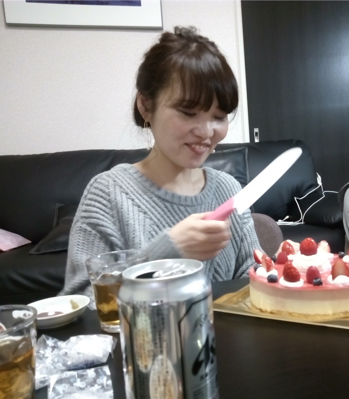 バースデーケーキも自分で切って、出来上がってる連中に取り分けるかおりん。