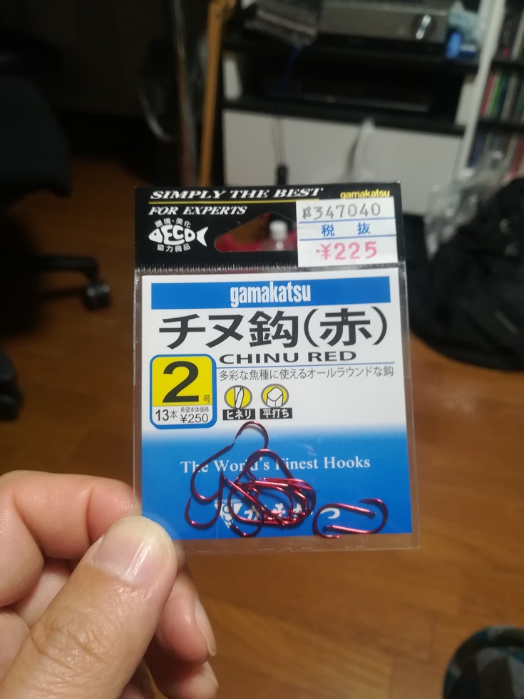 赤いチヌ針なんて売ってたよ@沼津の釣具屋。