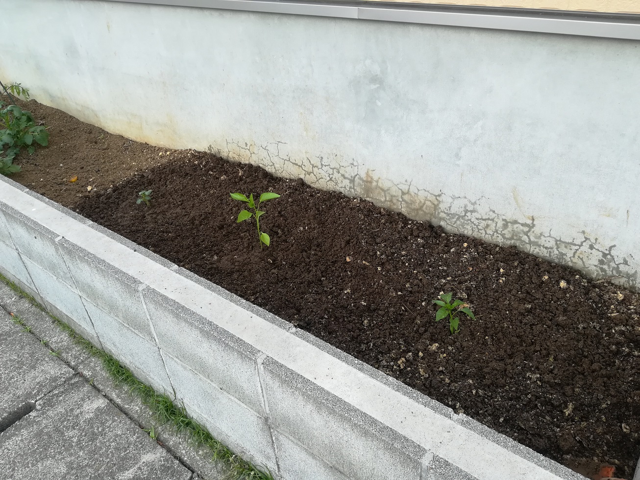 ピーマンとオクラの苗を買ってきて、職場の花壇に植える。