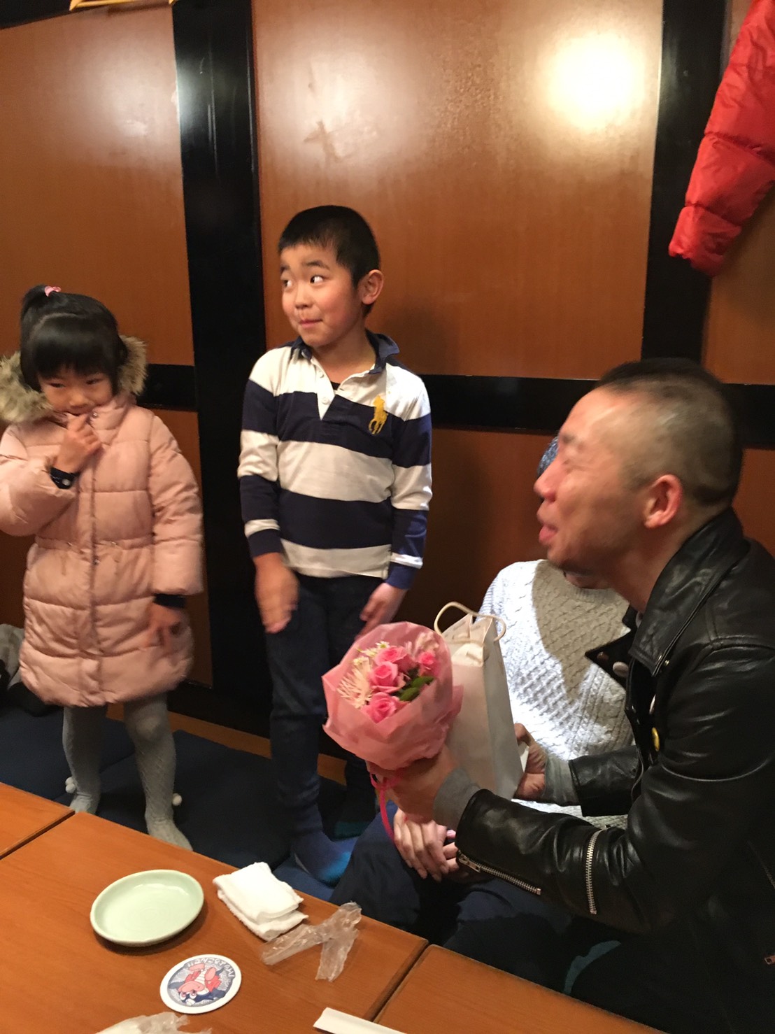 入念に「何も持ってこないでよ!!」なんて言ったんだが、子供たちに花束をいただいてしまったよ。