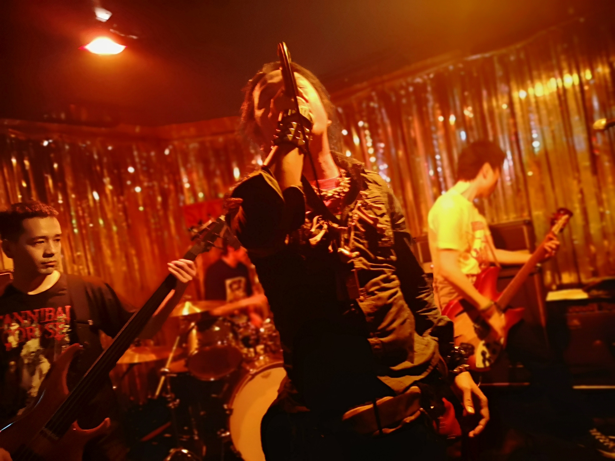 ベースの音をギターアンプ、ベースアンプから同時に出し、もの凄いパワーのドラムとドスの効いたボーカル!