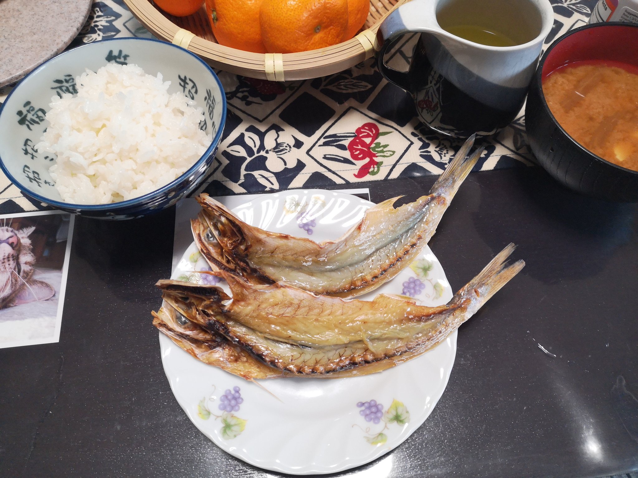 日曜の朝は、先週釣って作っておいたカマスの干物を食べたんだ。